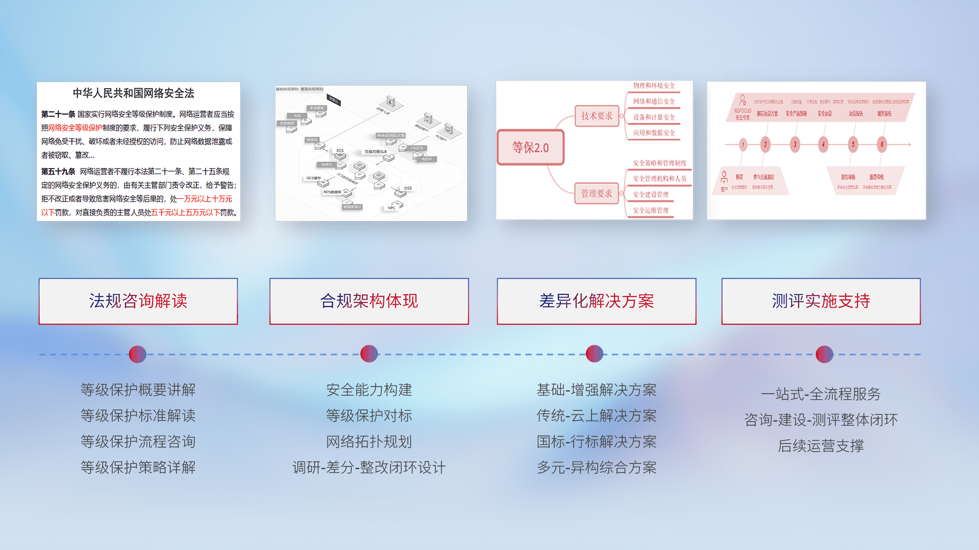 通过专业的法律咨询解读、、、、合规架构体现、、、差异化解决方案、、测试实施支持等服务,,为客户量身打造等保合规体系。。